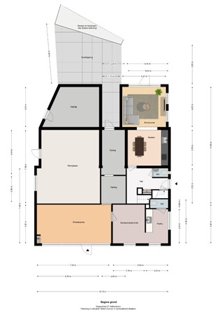 Parterre: winkelruimte, magazijn, achterentree, kantoor. Entree/hal, toilet, kelder, woonkamer, woonkeuken.
