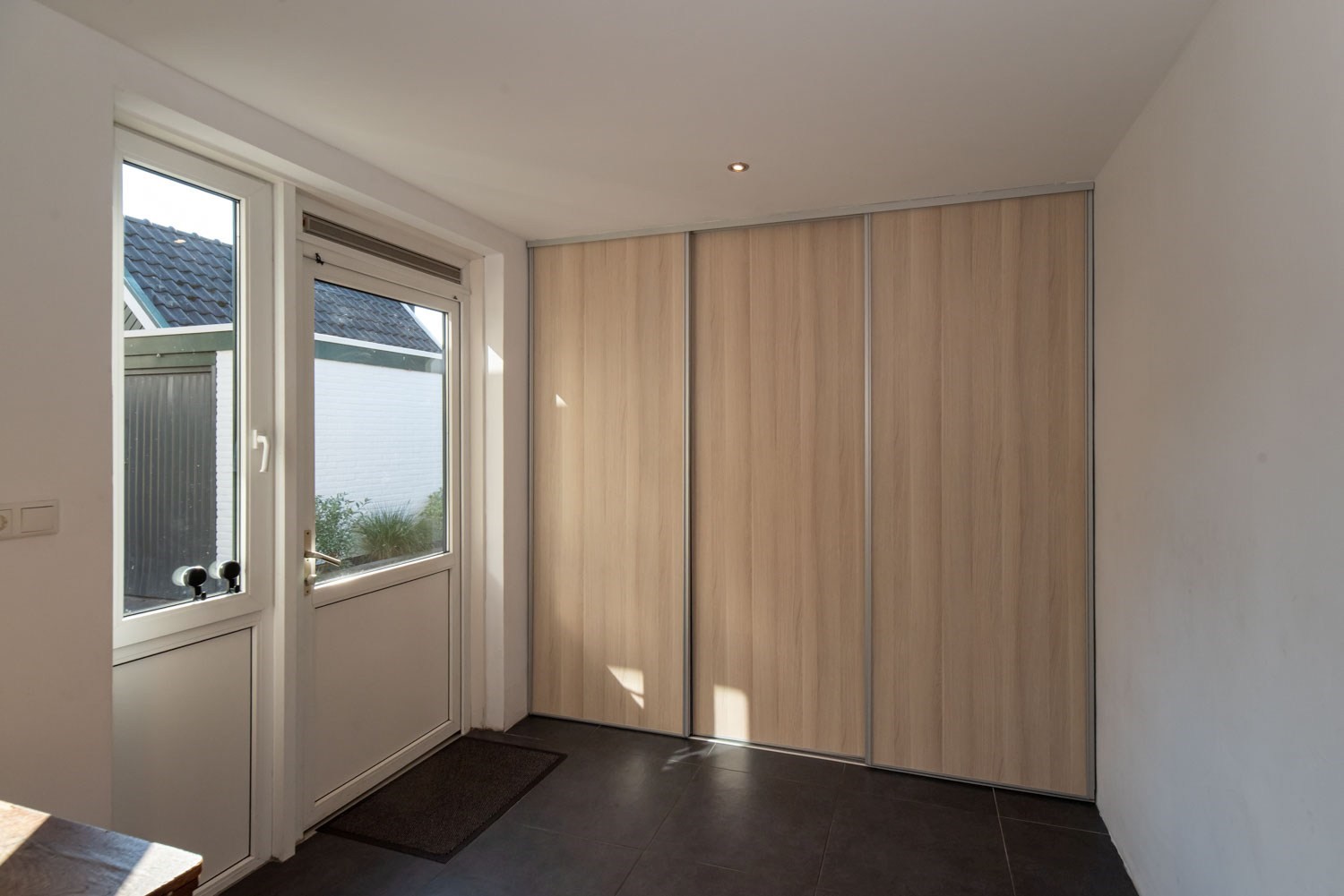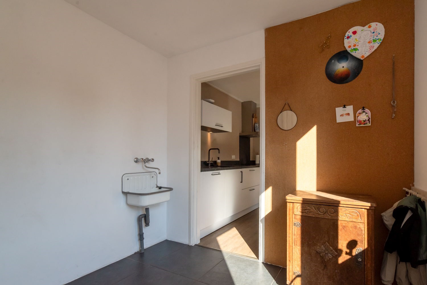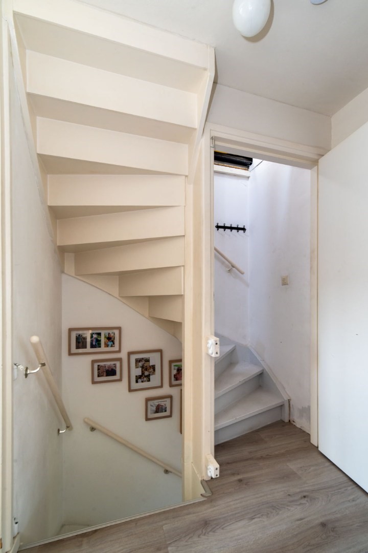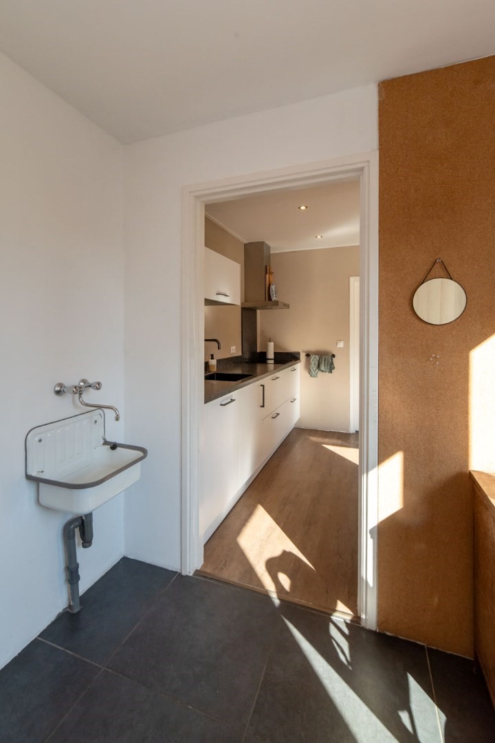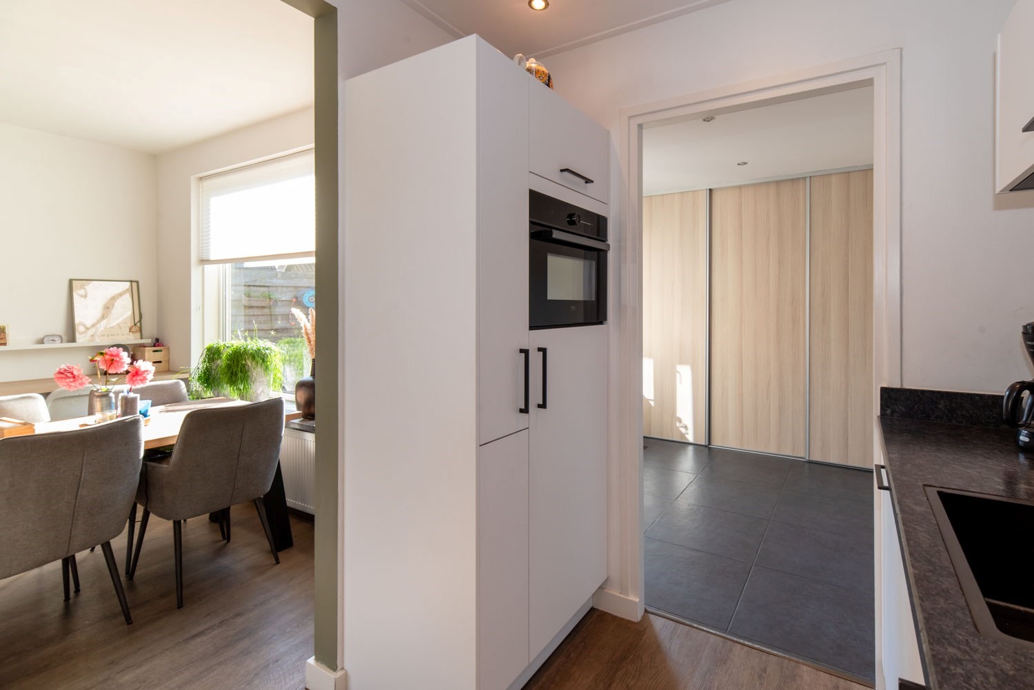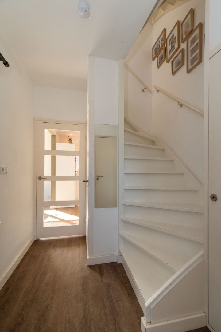 Parterre: entree/hal, vernieuwde meterkast, vernieuwd hangtoilet met fontein, trapkast, heel lichte woonkamer, halfopen uitgebouwde keuken v.z.v. moderne inrichting (2023) met inductiekookplaat, rvs schouwmodel afzuigkap, vaatwasser, koelkast en combimagnetron. Voorts heel royale achterentree / bijkeuken met kastenwand.