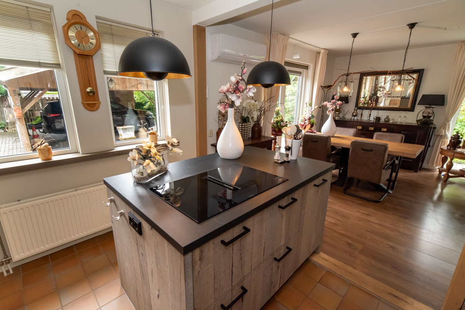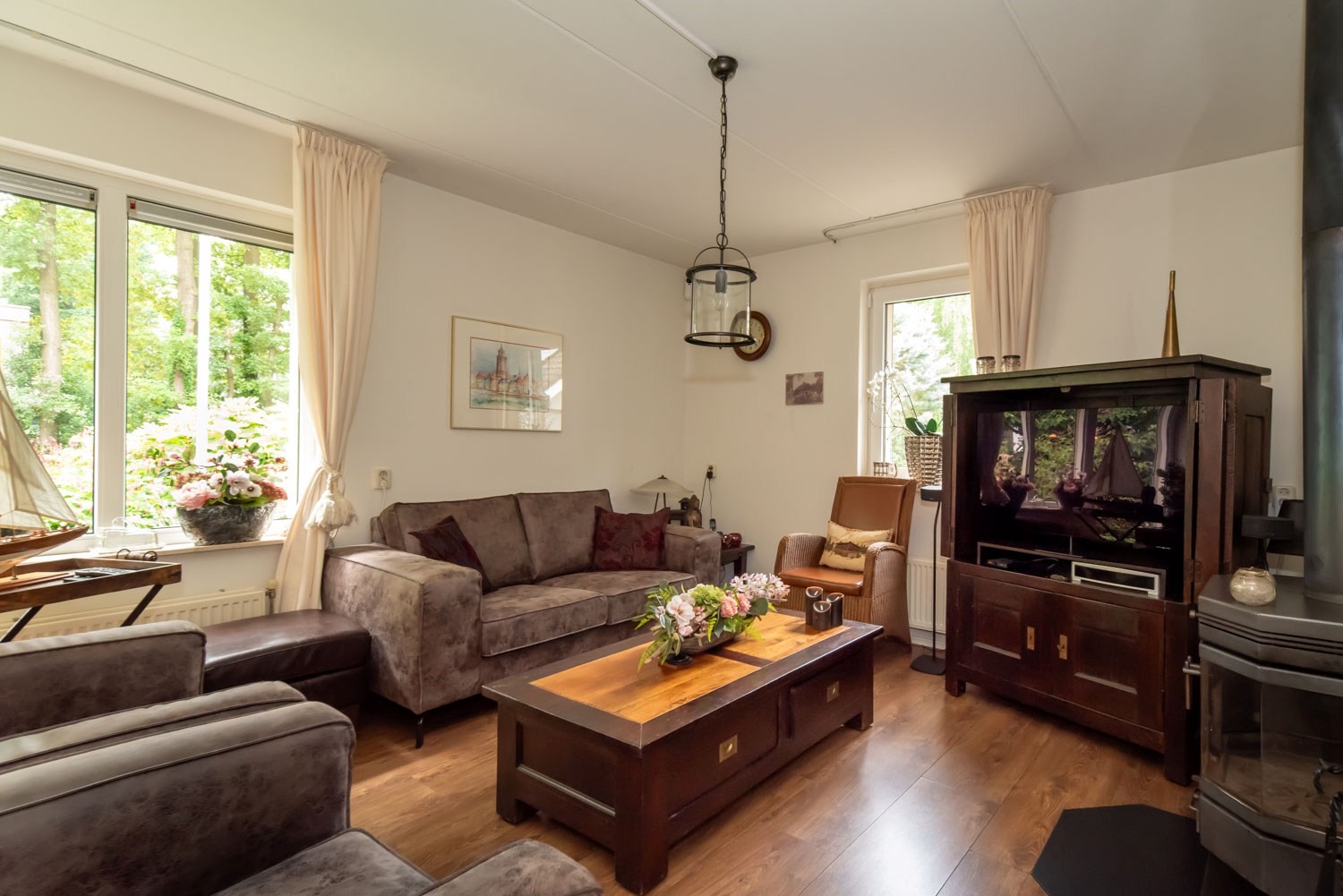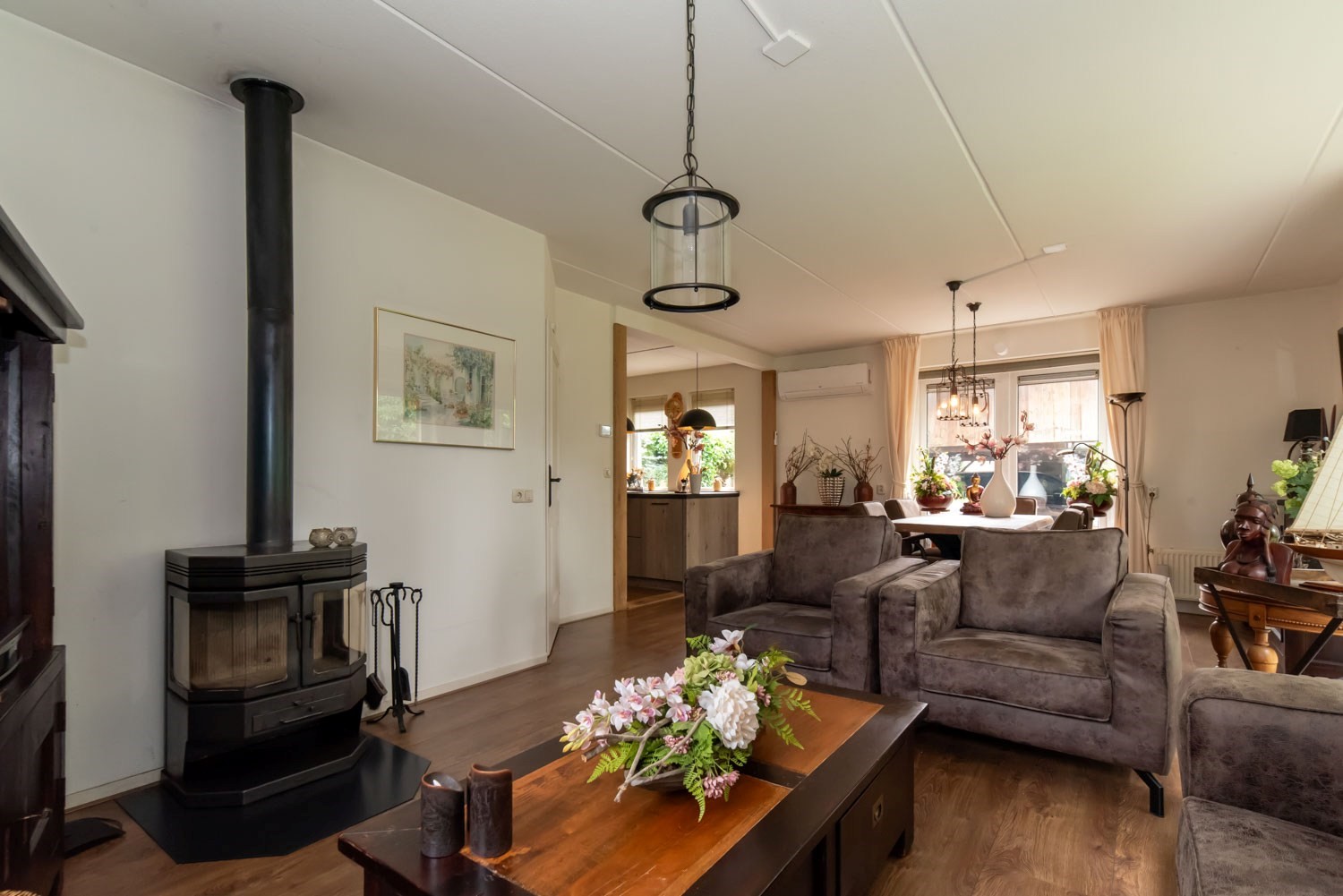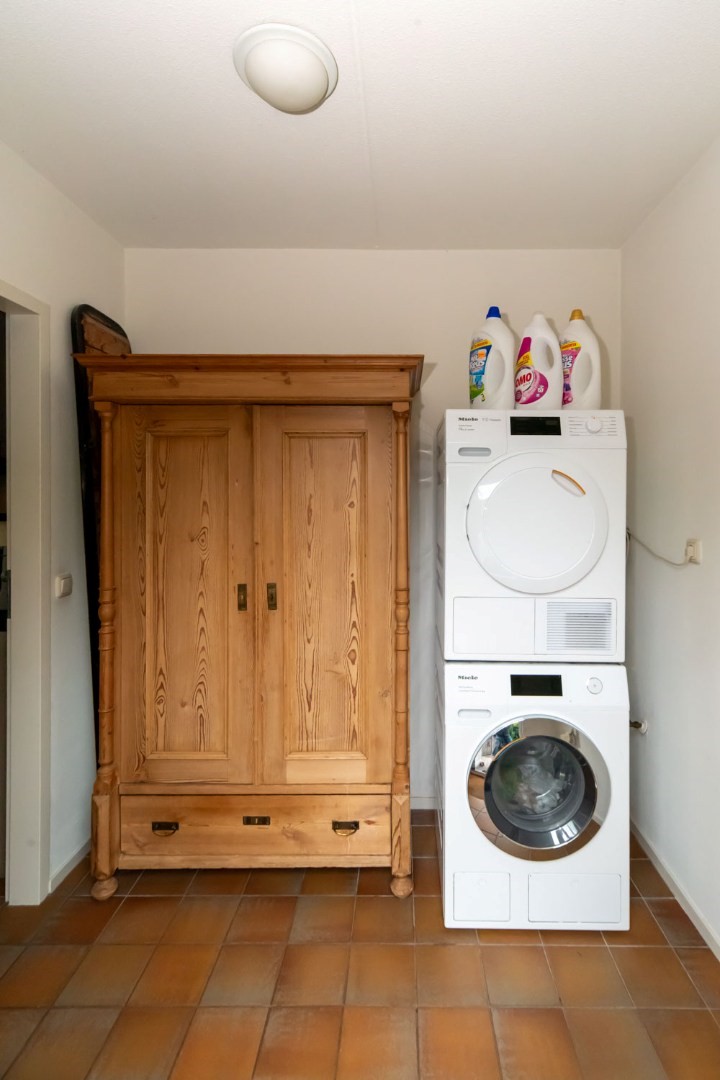 Parterre: entree/hal met trapopgang, luxe, vernieuwd Japans hangtoilet en wastafel, sfeervolle woonkamer met o.a. houtkachel, tuindeuren naar terras en veel daglicht. Voorts open keuken met recent geplaatste, uiterst luxe top kwaliteit keuken met Siemens inbouwapparatuur: inductiekookplaat met geïntegreerde afzuiging, vaatwasser op hoogte, luxe oven / combimagnetron, vergrootte koelkast, heel veel korven / laden / kasten. Op de begane grond ook een grote slaapkamer met aangrenzende badkamer v.z.v. inloopdouche en wastafelmeubel en een achterentree / bijkeuken.