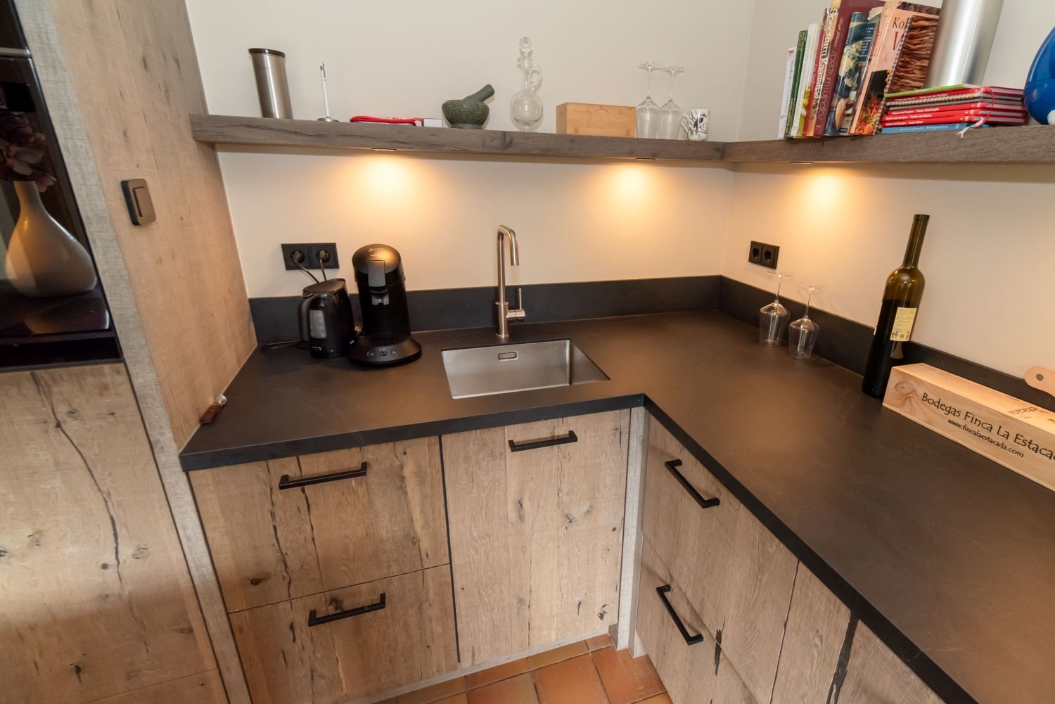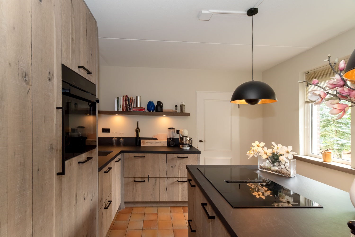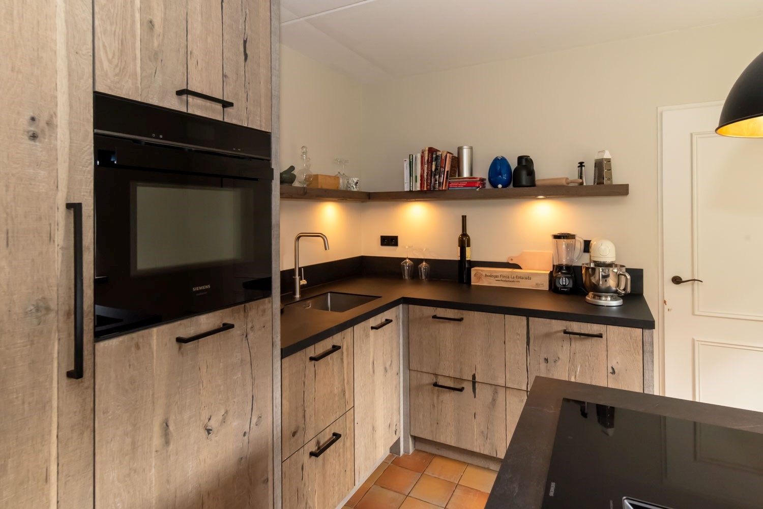 Parterre: entree/hal met trapopgang, luxe, vernieuwd Japans hangtoilet en wastafel, sfeervolle woonkamer met o.a. houtkachel, tuindeuren naar terras en veel daglicht. Voorts open keuken met recent geplaatste, uiterst luxe top kwaliteit keuken met Siemens inbouwapparatuur: inductiekookplaat met geïntegreerde afzuiging, vaatwasser op hoogte, luxe oven / combimagnetron, vergrootte koelkast, heel veel korven / laden / kasten. Op de begane grond ook een grote slaapkamer met aangrenzende badkamer v.z.v. inloopdouche en wastafelmeubel en een achterentree / bijkeuken.
