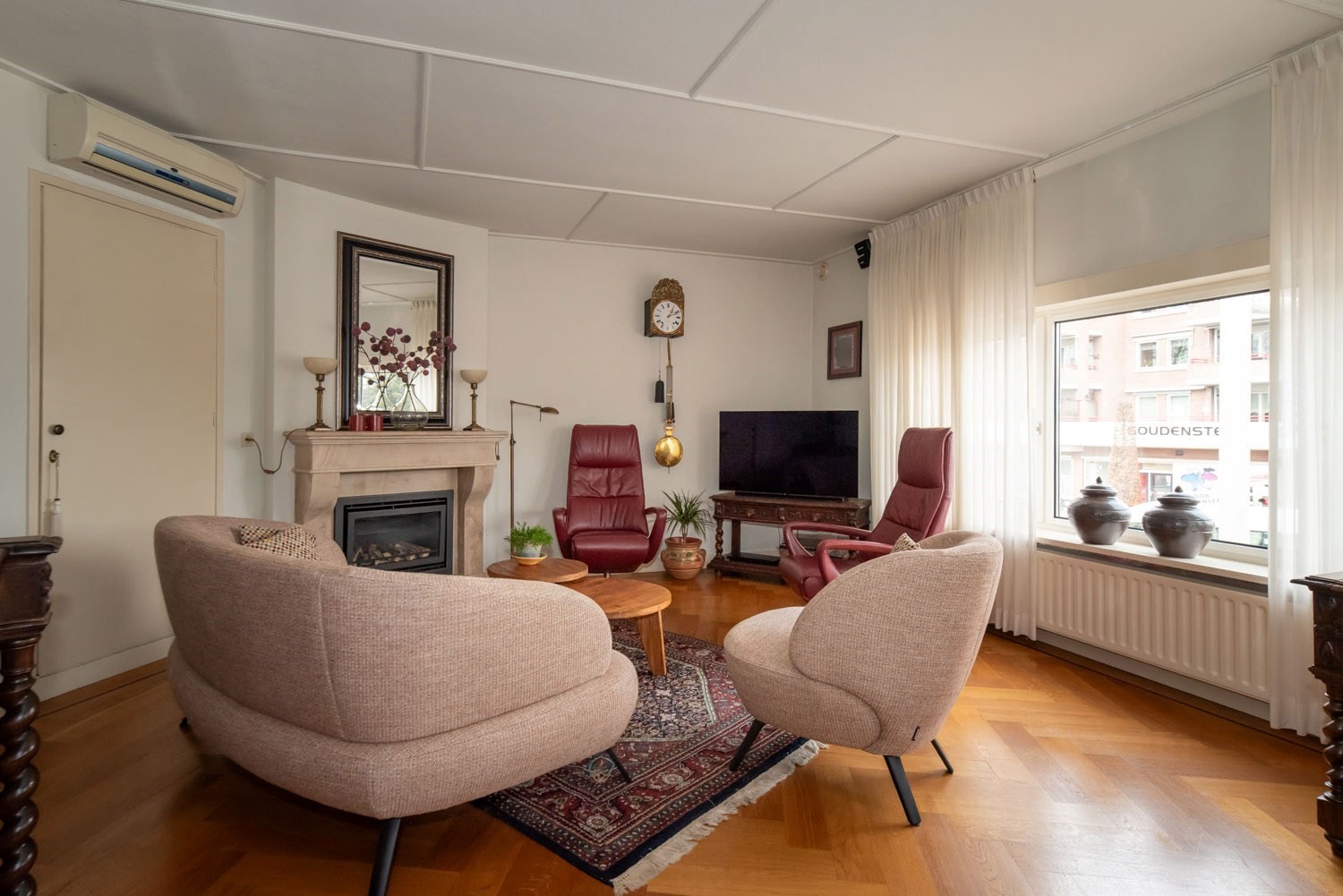 1e verdieping: overloop, sfeervolle woonkamer met schouw en parketvloer en met fraai uitzicht op kruising, keuken v.z.v. inrichting met gaskookplaat, afzuigkap en combimagnetron, 2 grote slaapkamers, heel royale badkamer met ligbad, inloopdouche, badkamermeubel en hangtoilet, bergruimten.