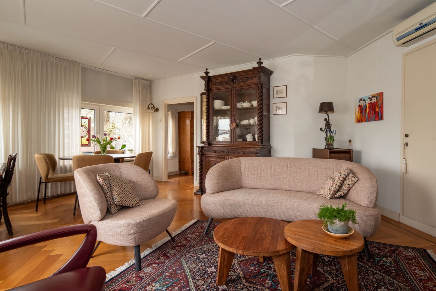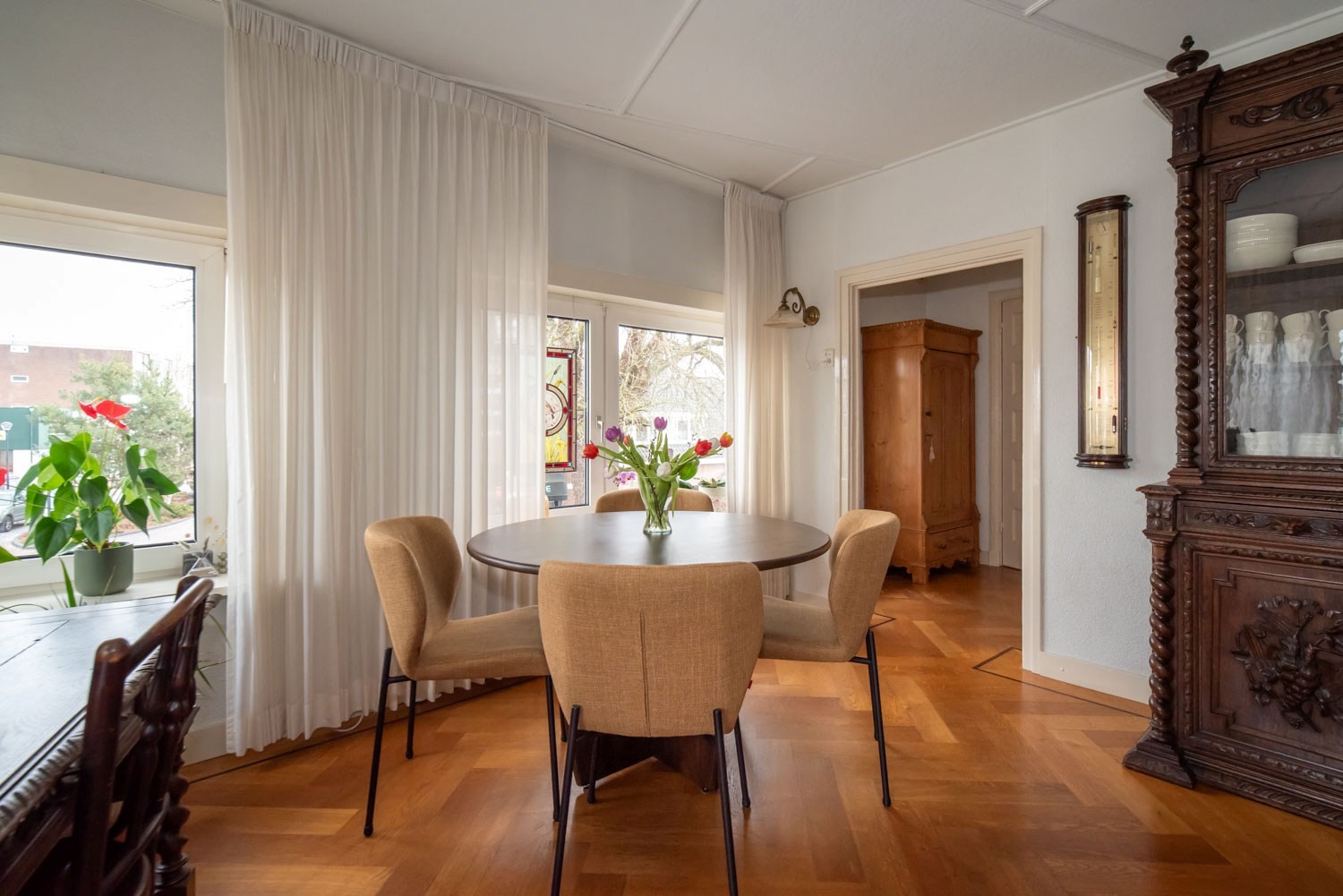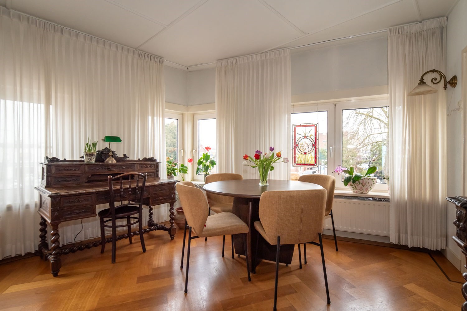 Dit betreft de op de hoek gesitueerde woning: verrassend ruim, uiterst solide en fraaie details.