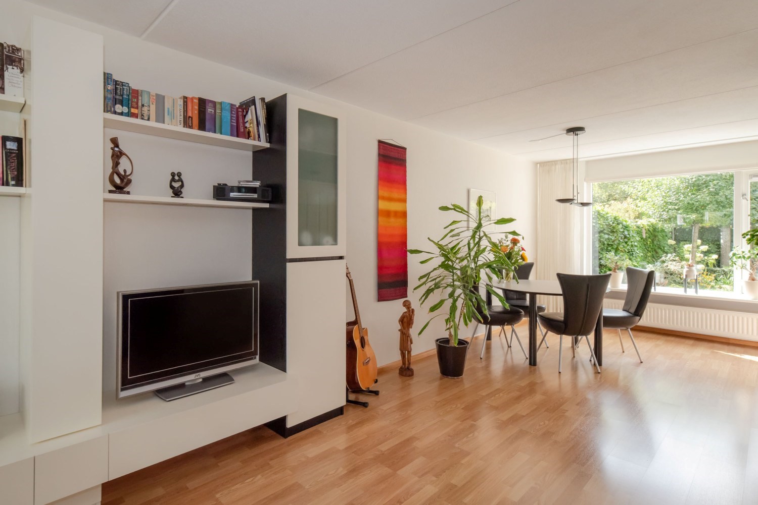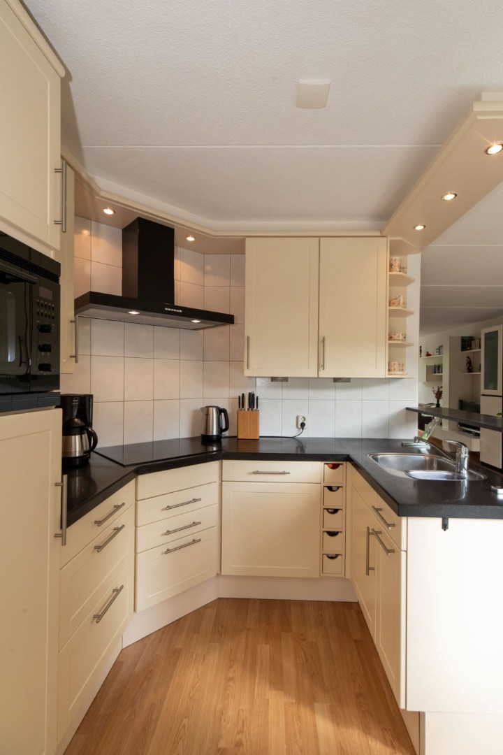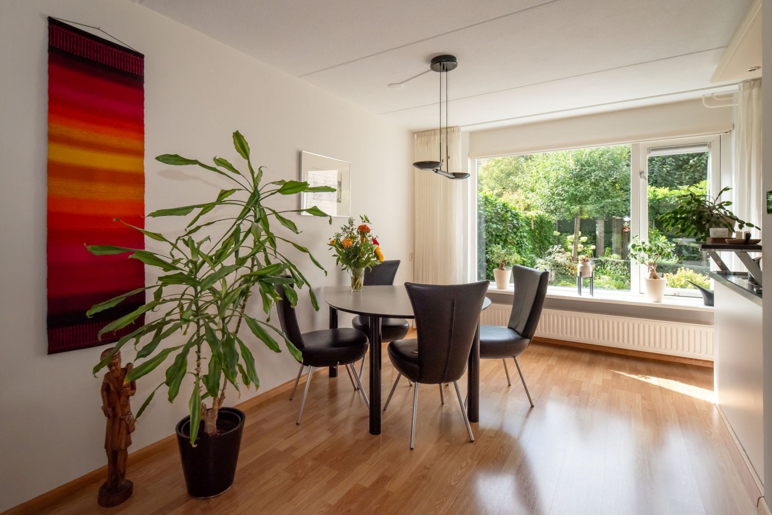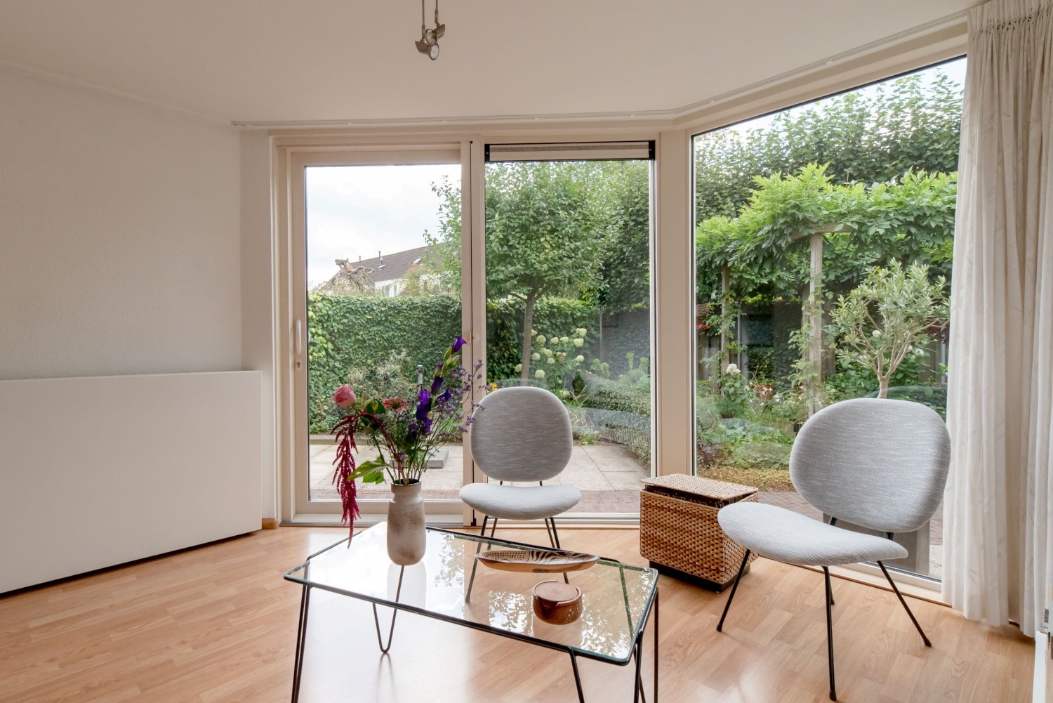 Parterre: heel ruimte/lichte entree/hal, uitgebreide meterkast, WC met hangtoilet, fontein en vloerverwarming, ruime woonkamer met erker, halfopen keuken v.z.v. inbouwapparatuur: inductiekookplaat, vaatwasser, combimagnetron, koelkast, afzuigkap. Voorts extra (tuin)kamer met goede zonligging, veel glas en schuifpui naar achtertuin.