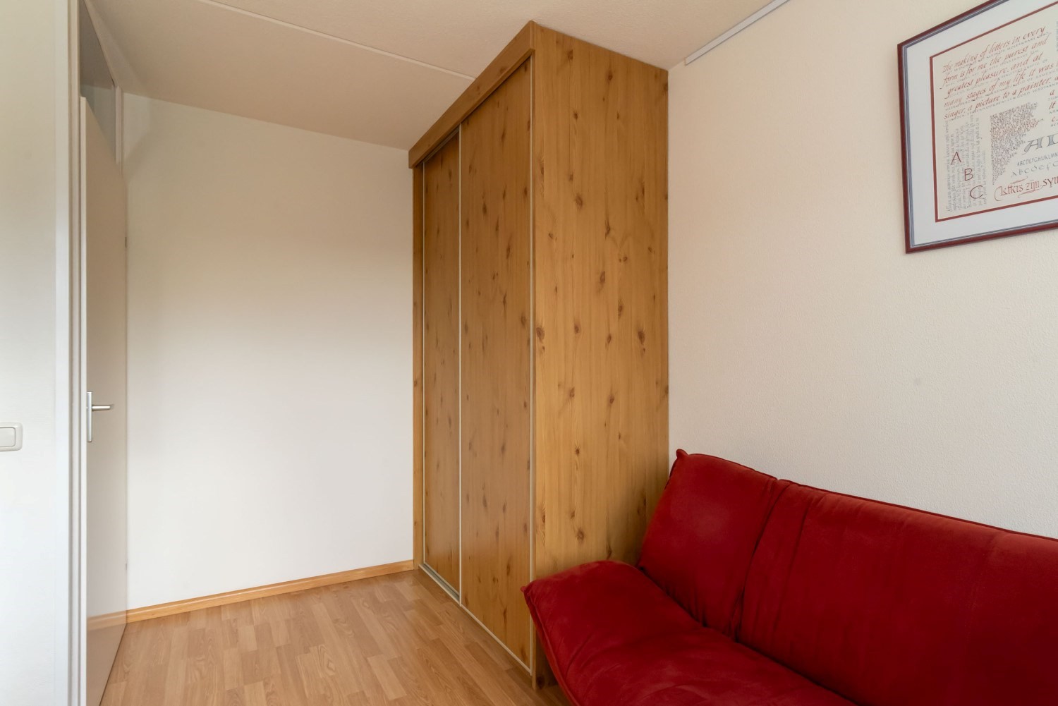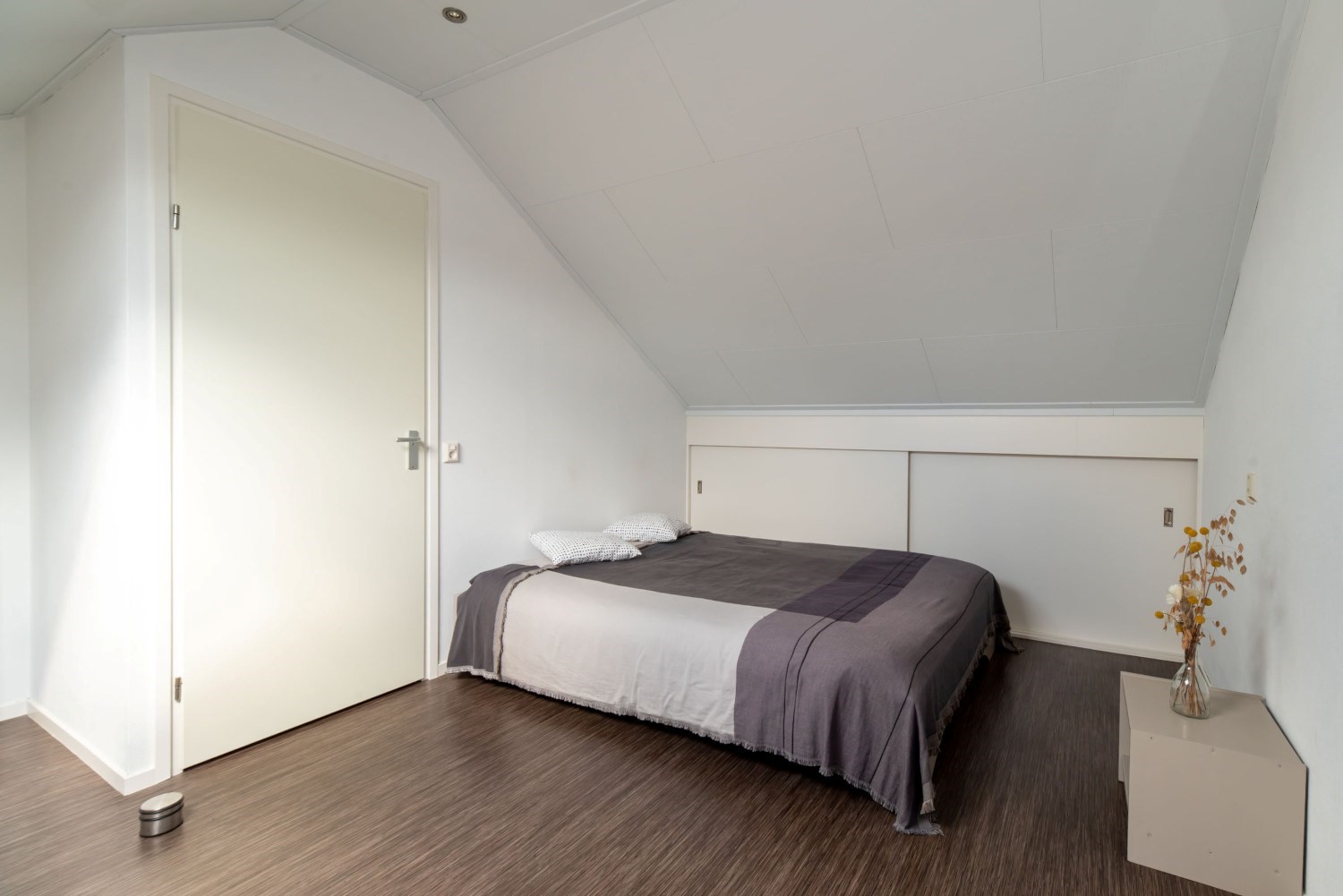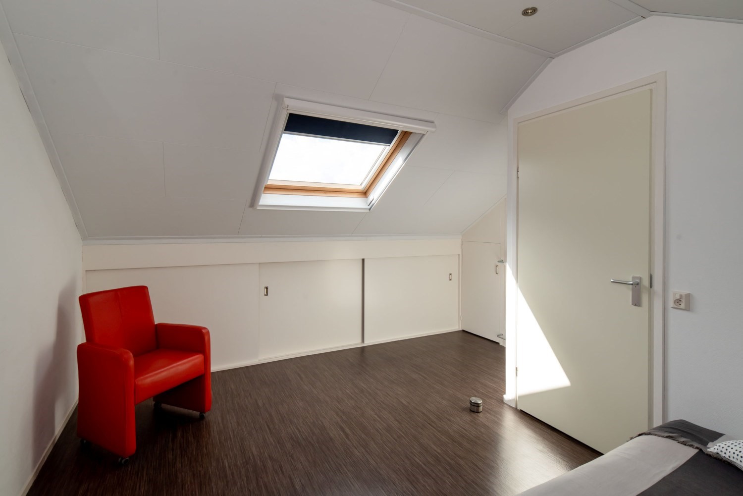 2e Verdieping: vaste trap naar overloop en grote 4e (slaap)kamer met Velux dakraam met elektrische verduistering en hor.