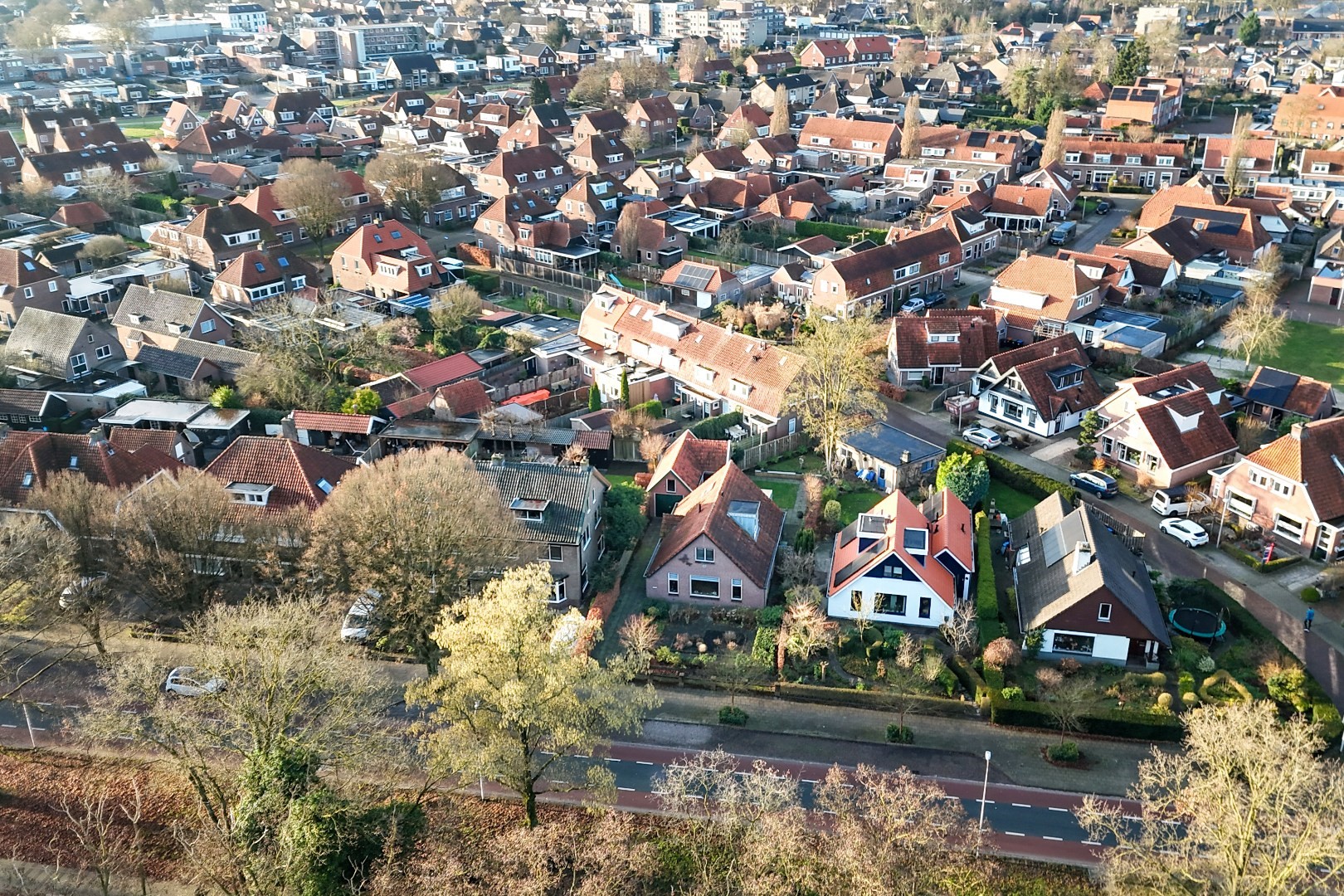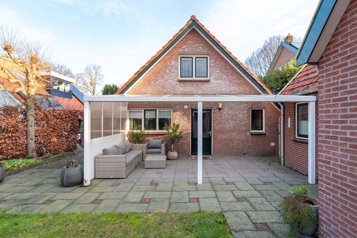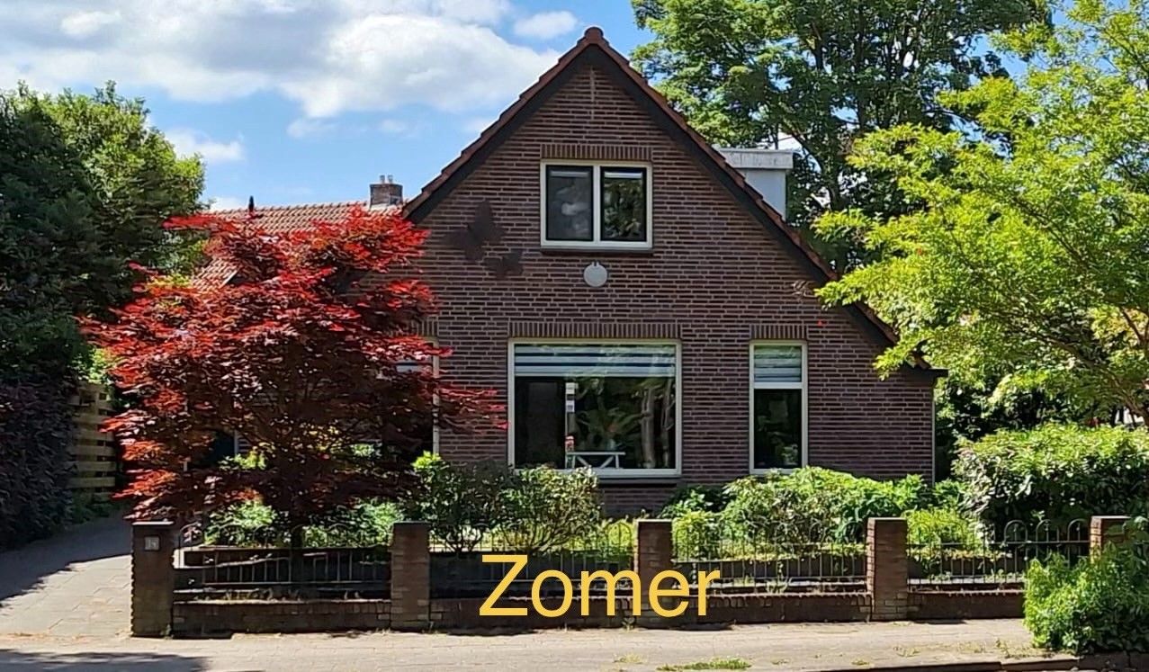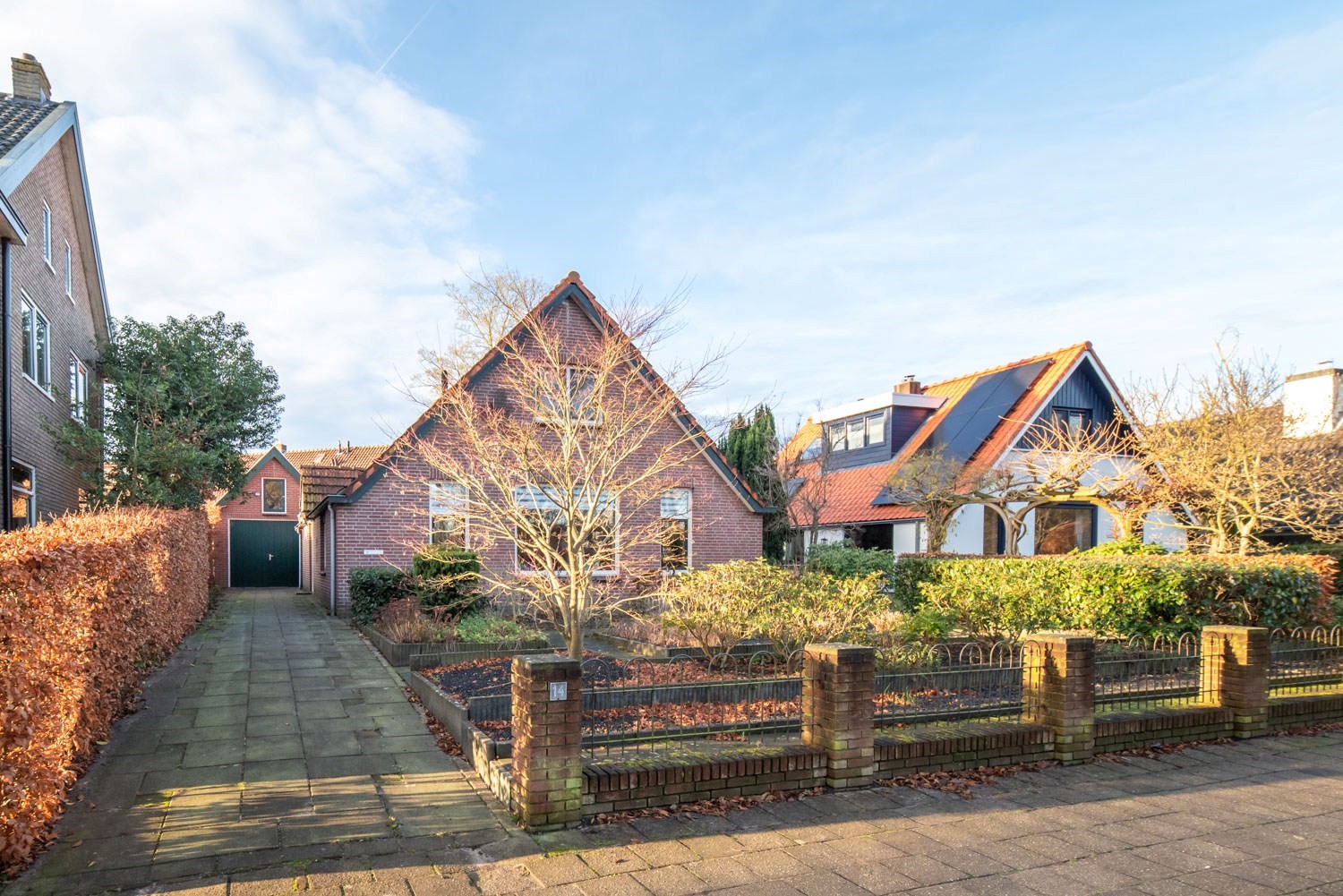 Uitstekend gesitueerd, direct bij centrum en tegenover groen, verbouwd / vergroot vrijstaand woonhuis, met o.a. grote vrijstaande garage / berging / hobbyruimte (L-vormig) en tuin rondom.