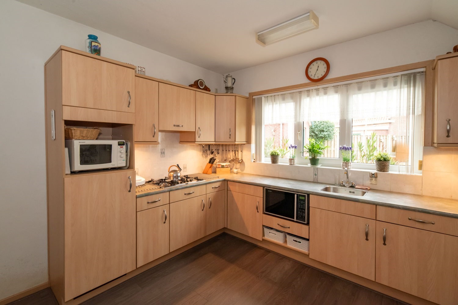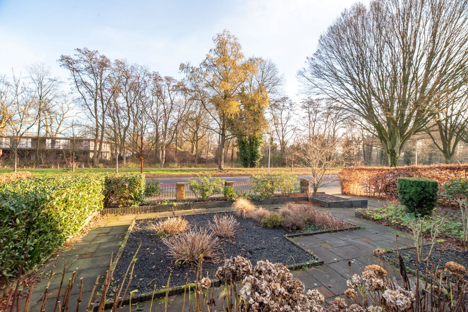 Parterre: royale entree/hal met garderobenis en trapopgang, ruim toilet met gangcloset en wastafel, vernieuwde, uitgebreide meterkast (ook krachtstroom), tussenhal, provisieruimte. Voorts grote living met fraai, vrij uitzicht (op groen), grote woonkeuken v.z.v. inrichting met 5-pits gaskookplaat, koelkast, afzuigkap. Via bijkeuken / achterentree naar tuin met grote veranda.