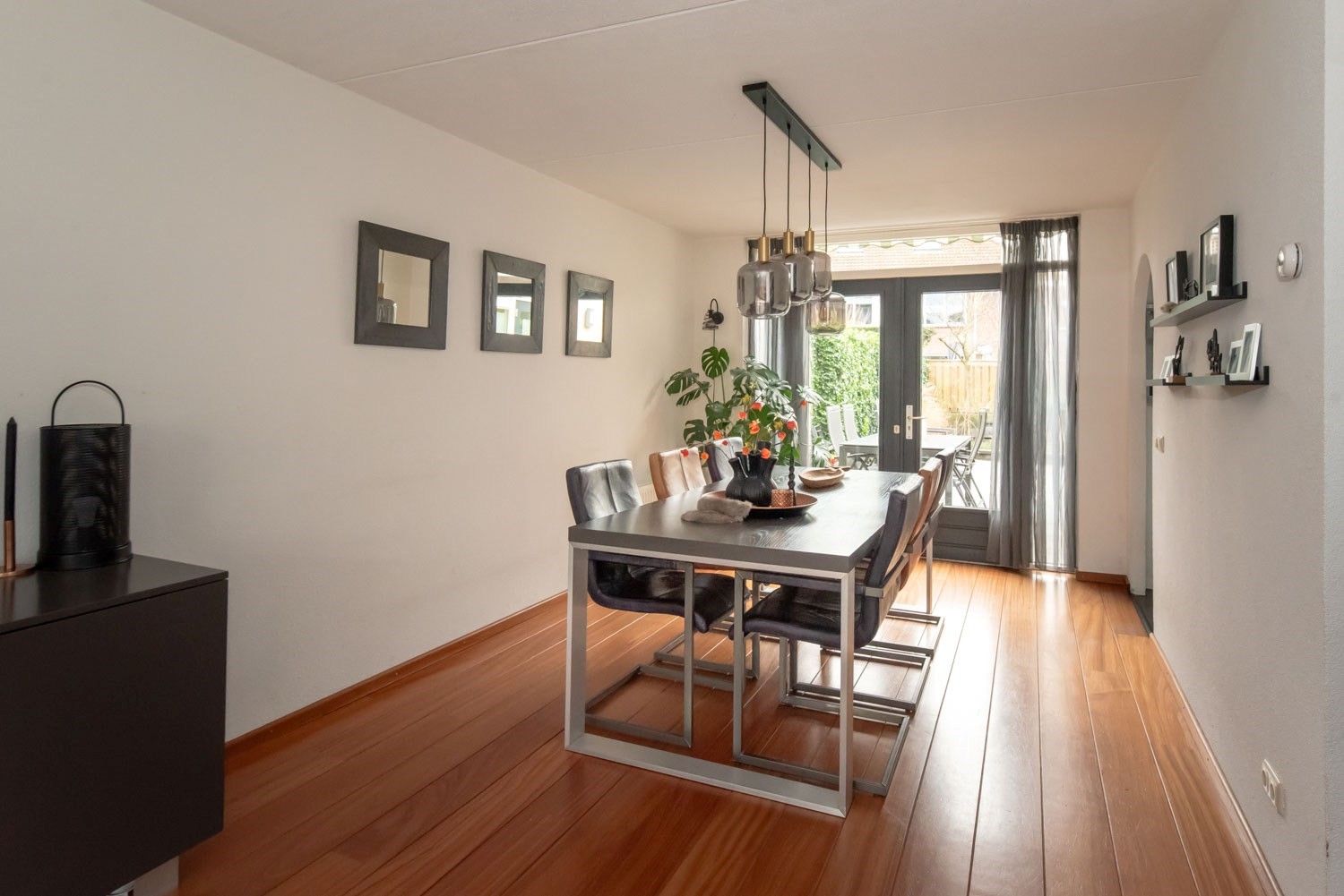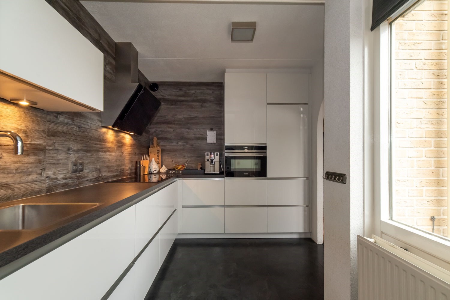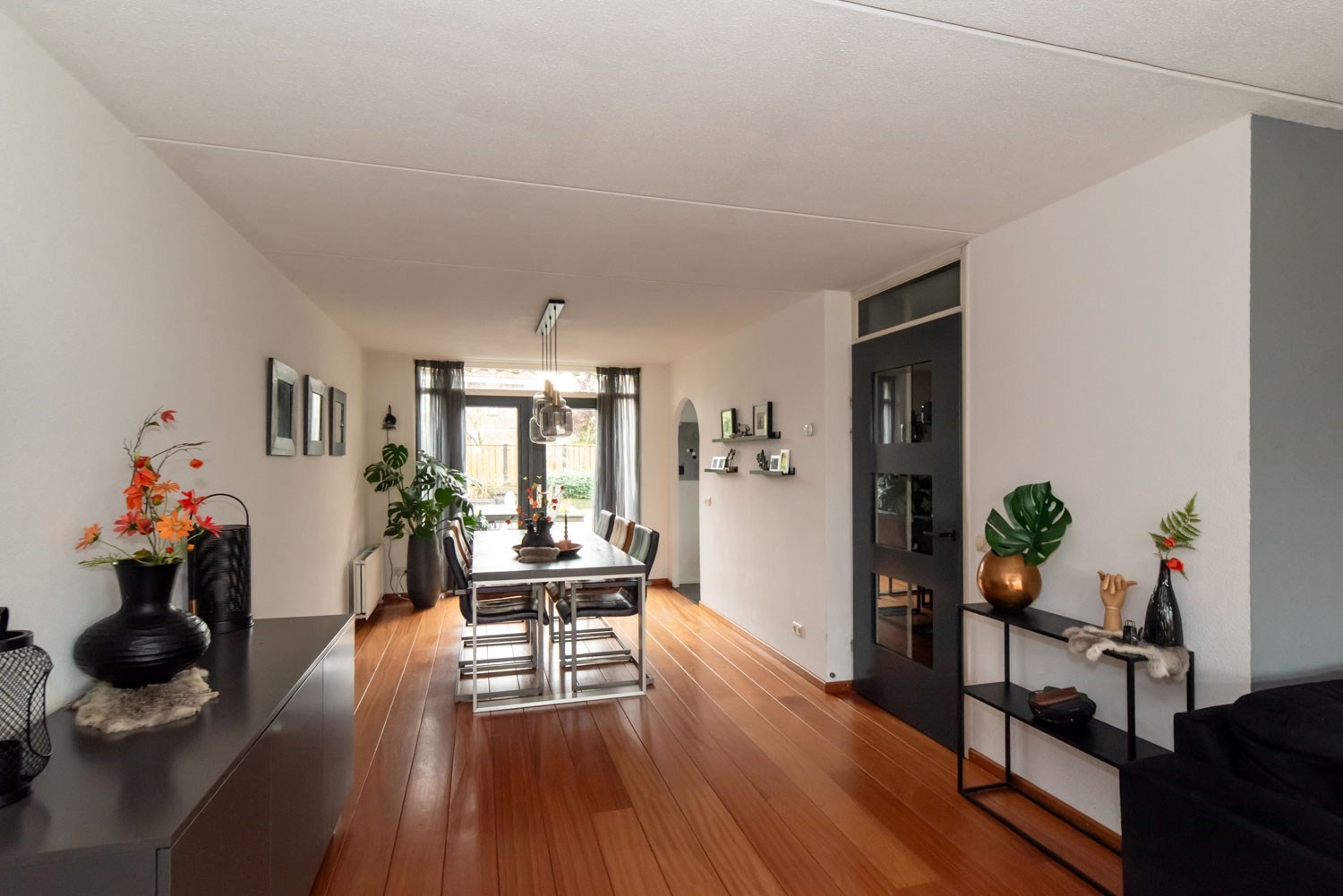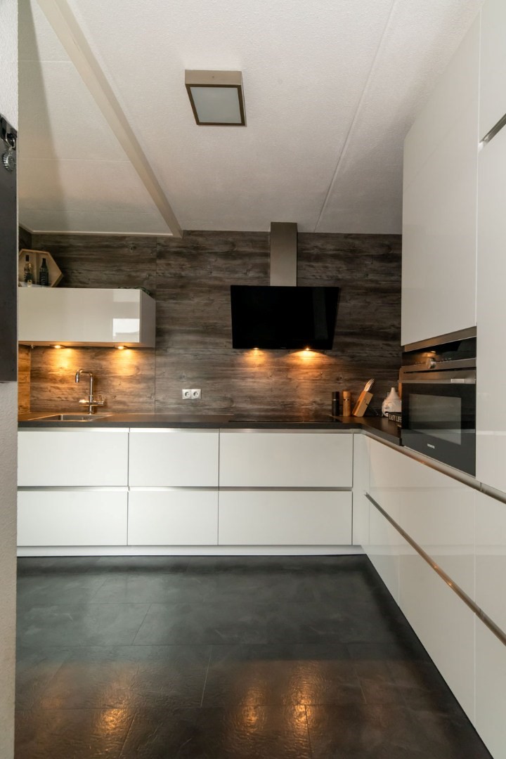 Parterre: entree/hal, uitgebreide meterkast, garderobenis, vernieuwd hangtoilet met fontein. Heel royale woonkamer met erker en prachtige massief houten vloer (Jatoba) en tuindeuren naar terras en tuin, halfopen keuken voorzien van moderne, hoogglans inrichting v.z.v. inductiekookplaat, afzuigkap, koelkast, oven met magnetronfunctie, Bosch vaatwasser (Zeolith functie, bouwjaar november 2025!) en een zo goed als nieuwe quooker (2025). Voorts bijkeuken / achterentree en een inpandig bereikbare garage.