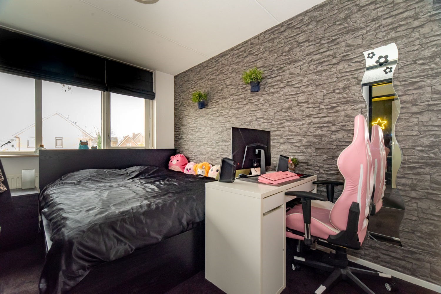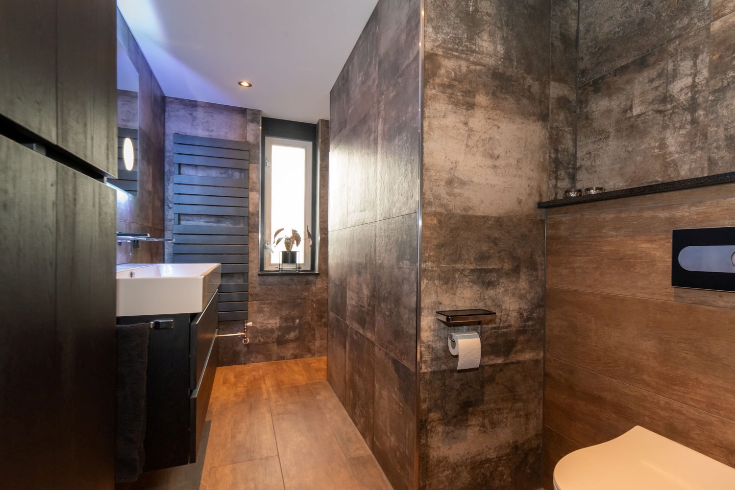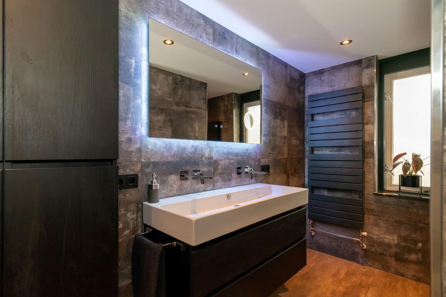 1e Verdieping: overloop, 3 slaapkamers, vernieuwde grote badkamer (2021) met inloopdouche, hangtoilet, fraai wastafelmeubel, designradiator, spanplafond, vloerverwarming, inbouwspotjes en luxe spiegel (verwarmd en met verlichting).